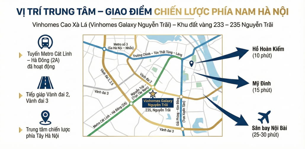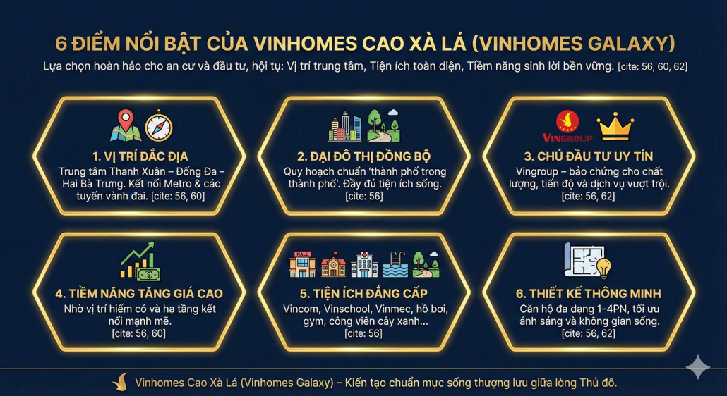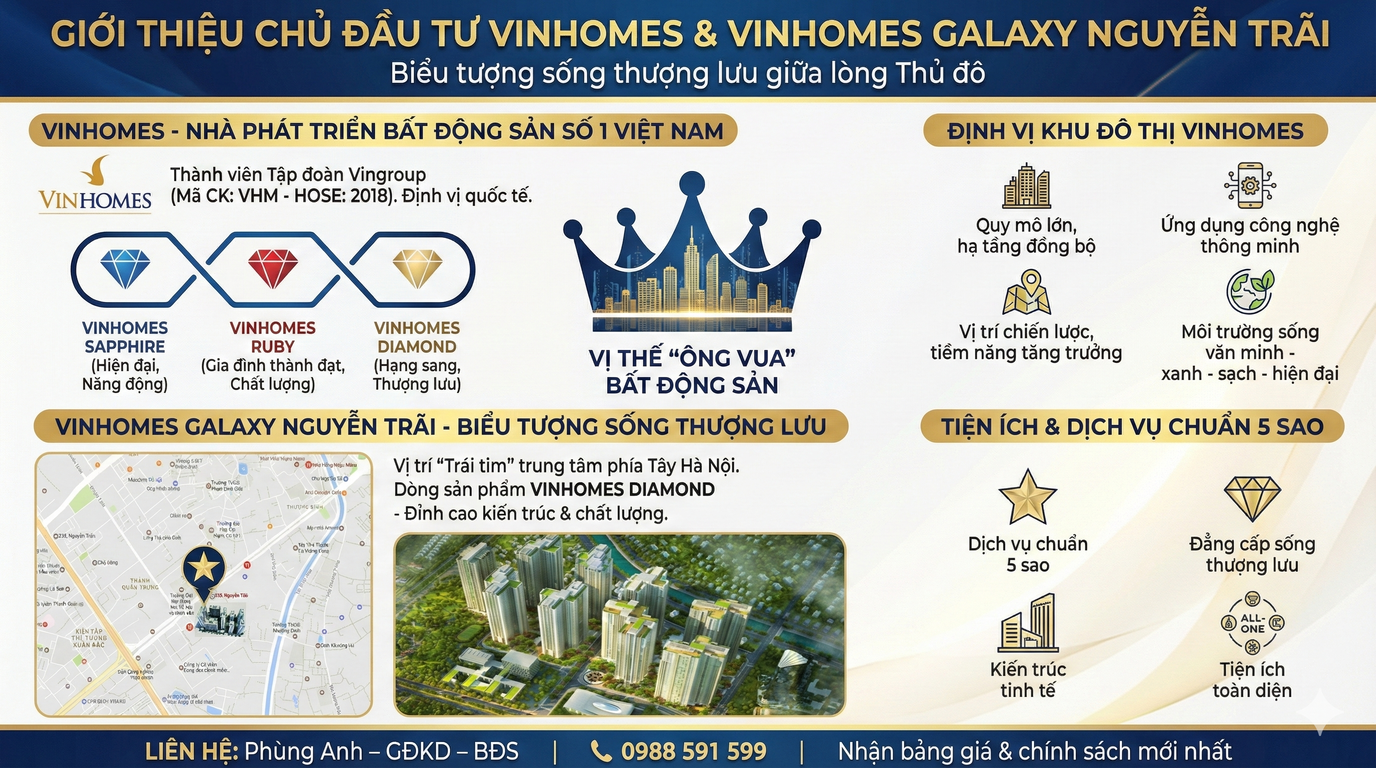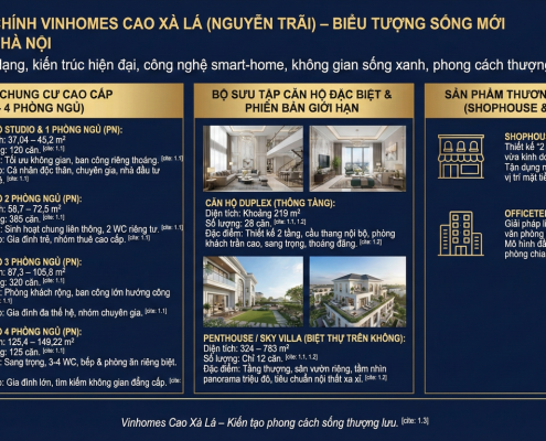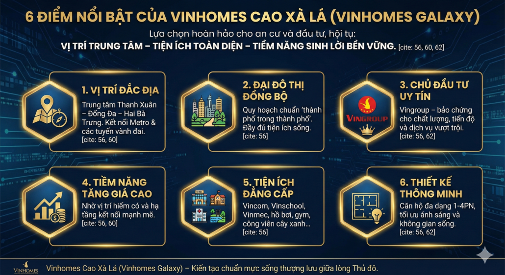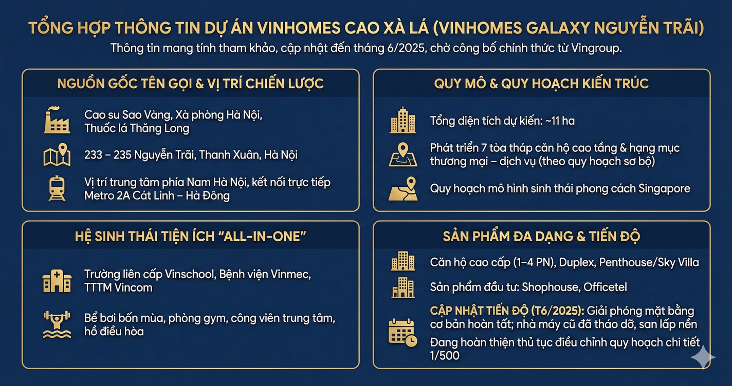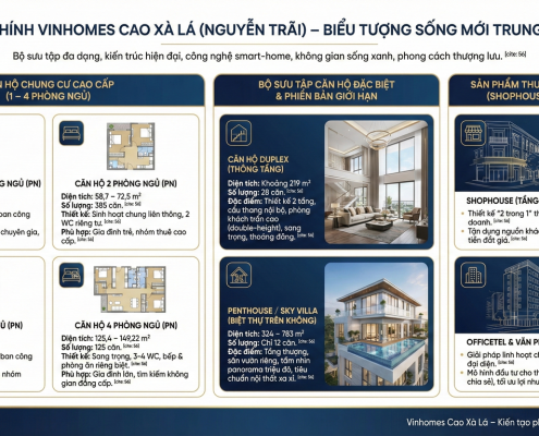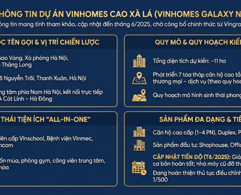 Vinhomes Cao Xà Lá (Vinhomes Galaxy Nguyễn Trãi) là dự án căn hộ cao cấp mới nhất của tập đoàn Vingroup, sở hữu vị trí vàng tại trung tâm quận Thanh Xuân, Hà Nội. Với quy hoạch đồng bộ, thiết kế sang trọng và hệ sinh thái tiện ích đẳng cấp, Vinhomes Cao Xà Lá hứa hẹn trở thành biểu tượng sống mới của Thủ đô.