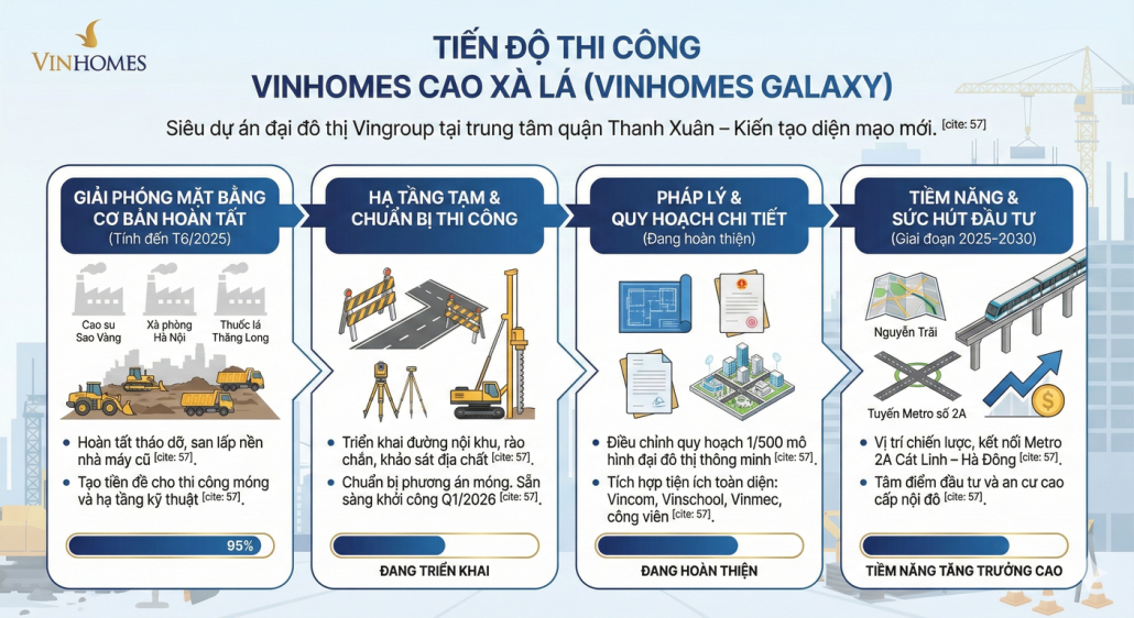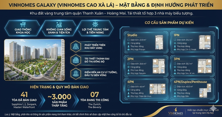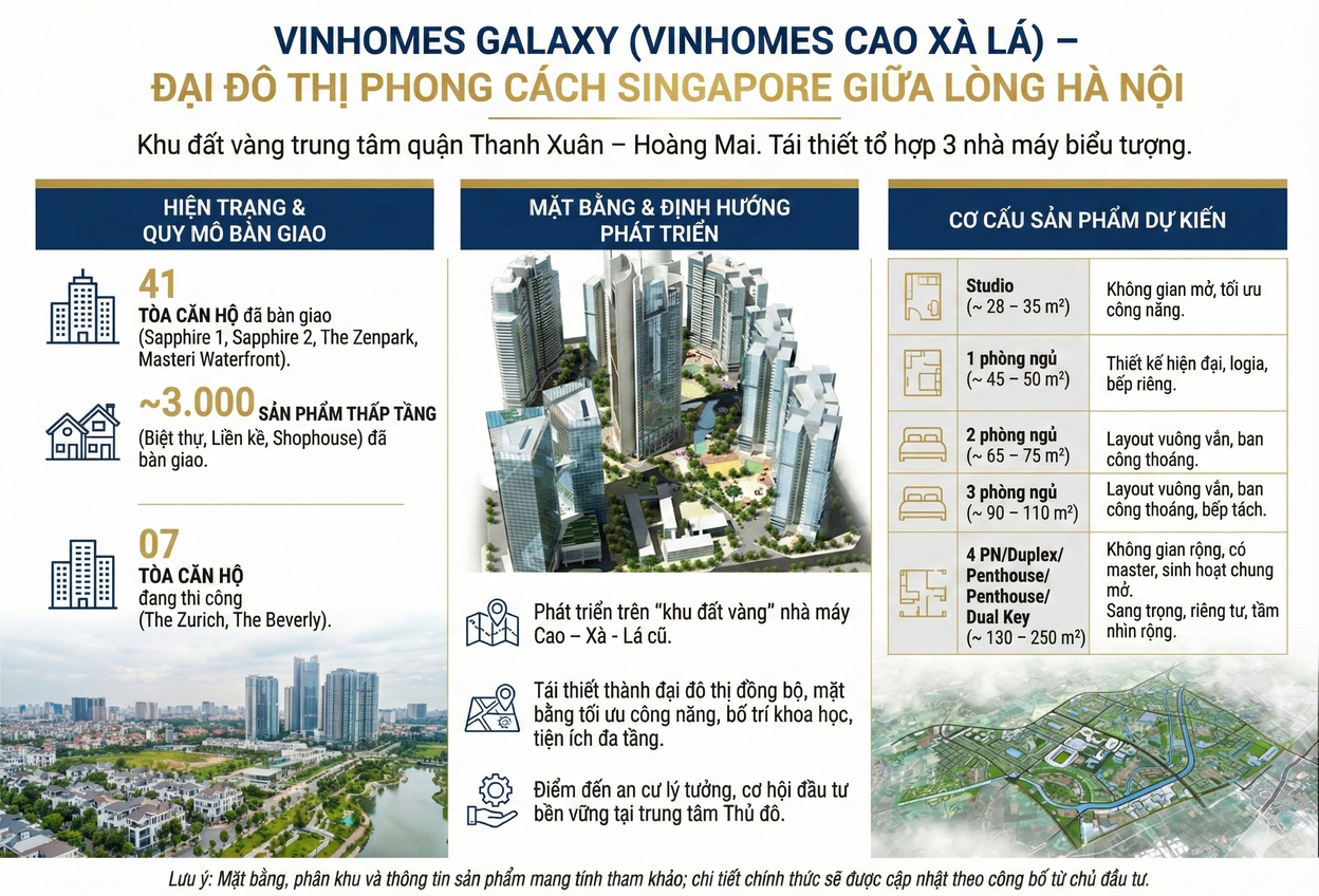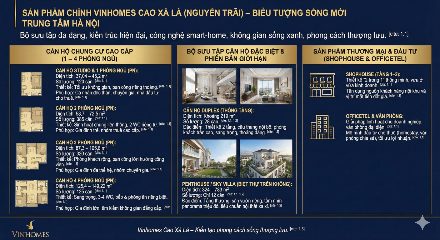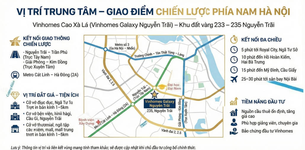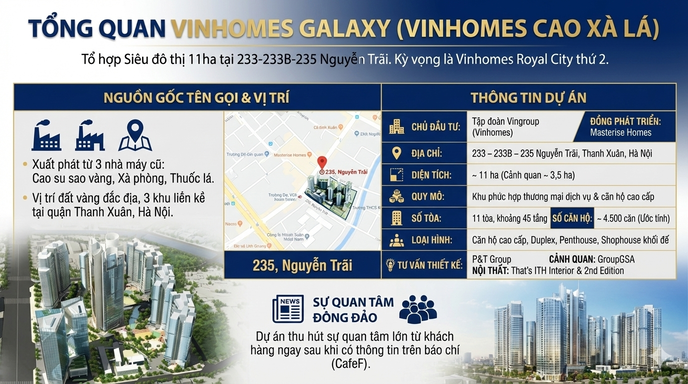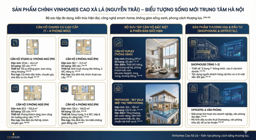 Vinhomes Cao Xà Lá (Vinhomes Galaxy Nguyễn Trãi) là dự án căn hộ cao cấp mới nhất của tập đoàn Vingroup, sở hữu vị trí vàng tại trung tâm quận Thanh Xuân, Hà Nội. Với quy hoạch đồng bộ, thiết kế sang trọng và hệ sinh thái tiện ích đẳng cấp, Vinhomes Cao Xà Lá hứa hẹn trở thành biểu tượng sống mới của Thủ đô.