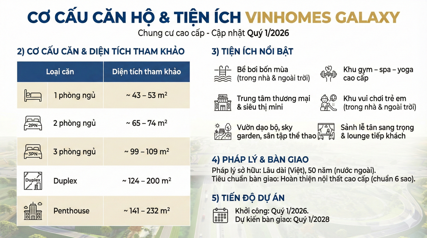 Vinhomes Cao Xà Lá (Vinhomes Galaxy) mang đến hệ sinh thái tiện ích “all-in-one” – tất cả trong một, đáp ứng trọn vẹn nhu cầu sống, học tập, làm việc và nghỉ dưỡng ngay trong khu đô thị.